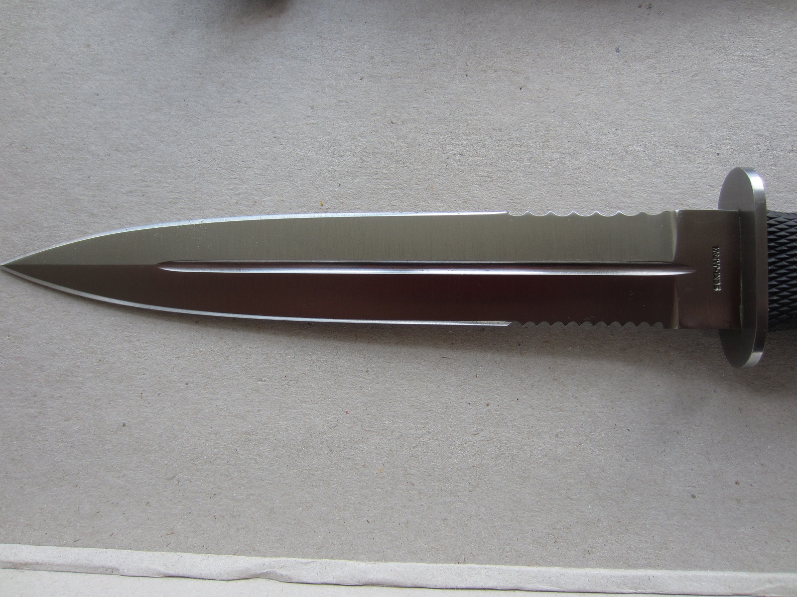 Description: One of 12 prototypes at the SHOT Show 2001 SOG display booth. It is marked SHOT Show 2001 Prototype on the brass butt. I believe it is SK-5 steel.